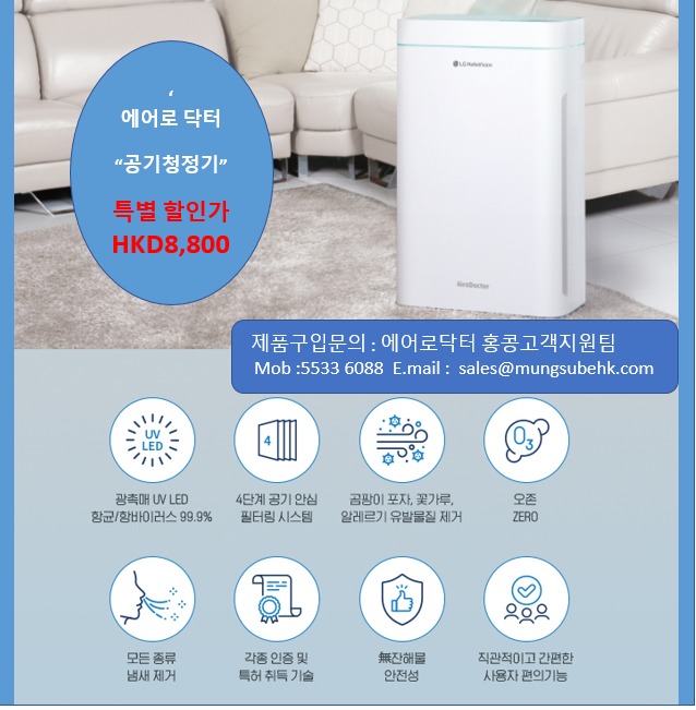 ***우리가정의 건강을 지켜주는 에어로닥터 공기청정기 특별가 HKD8,800 문의:5533 6088