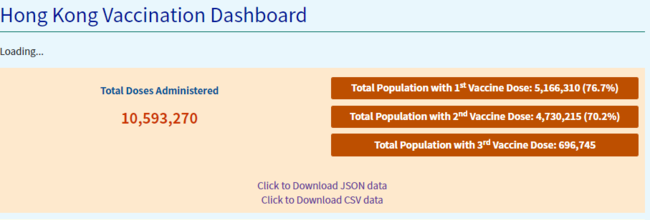 어제 18일 저녁 8시 현재, 홍콩 예방접종건이 10,593,270건으로 1차 접종률은 76.7%로 나타났고 2차 접종률은 70.2%로 기록됐다.