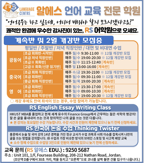 ▲ 알에스 어학원 : 1월 계속반 및 개강반 모집, 쾌적한 환경에 우수한 강사진이 있는 RS 어학원 (조단역 D출구에서 30초거리, 역을 등지고 “오른쪽”으로 코너를 살짝 돌면 건물입구) 문의 :9250-5687 / 광둥어 / 중국어 / 영어 /