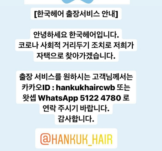 안녕하세요. 한국헤어입니다. 코로나 사회적 거리두기 조치로 저희가 자택으로 찾아가겠습니다.서비스 :컷트와 염색, 일반 롯드펌,남자펌 등 출장 서비스를 원하시는 고객님께서는 카카오ID : hankukhaircwb 또는 왓셉 WhatsApp 5122 4780 로 연락 주시기 바랍니다