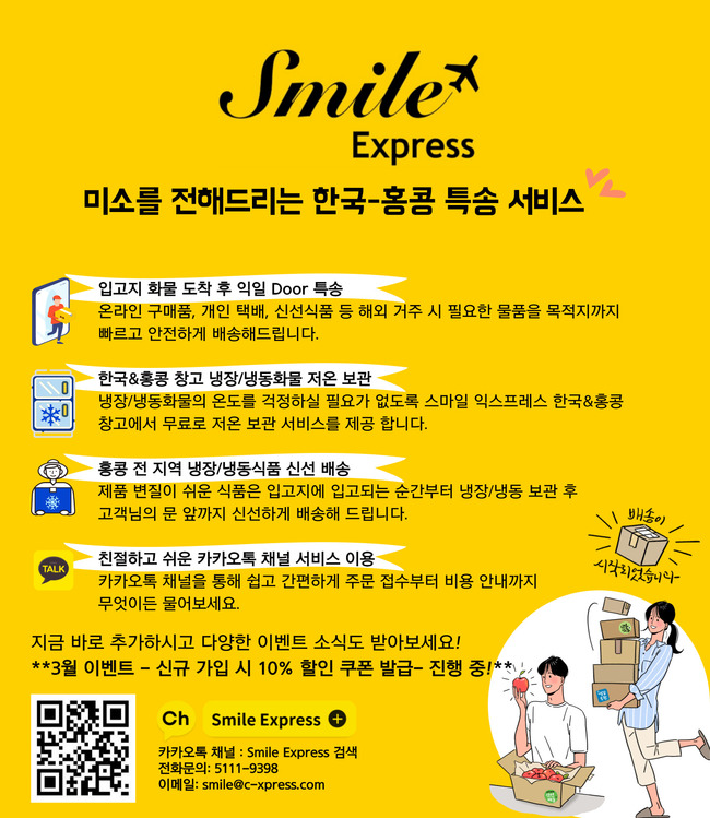▲Smile Express: 미소를 전해드리는 한국-홍콩 특송 서비스/ 냉장 냉동식품 신선보관 및 배송/ 카카오톡 채널 [Smile Express] 추가하여 쉽고 빠른 상담과 다양한 이벤트를 누리세요 :D / **3월 이벤트 – 신규 가입 시 10% 할인 쿠폰 발급- 진행 중!**/ 문의: 5111-9398 & smile@c-xpress.com