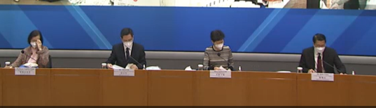 13일 오전 현재, 캐리 람 장관, 식품보건부 장관, 기술혁신부 장관, 홈어페어 장관대행이 방역대책 관련 언론브리핑 중이다.