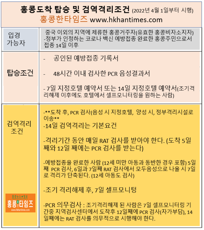 ■ 홍콩입경 탑승 및 검역격리 조건(4월 1일부터 시행)