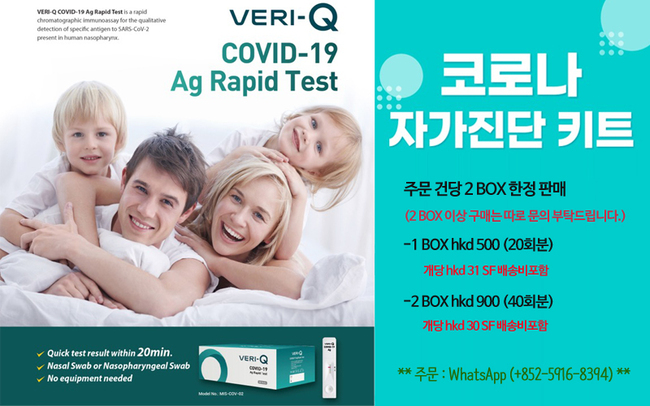 ■한국산 코로나 진단키트 한정특가 / 주문 건당 2box 한정 /1box $500 (20회분 배송비포함) 2box $900 (40회분 배송비포함) 왓츠앱 메세지로 주문 부탁드립니다. (연락처+852-5916-8394)