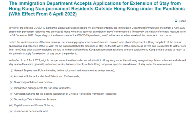 7일, 이민국이 코로나 5차확산 상황을 고려하여 홍콩이외에 거주하고 있는 홍콩비영주권자대상으로 체류 비자 연장을 허용한다고 밝혔다.