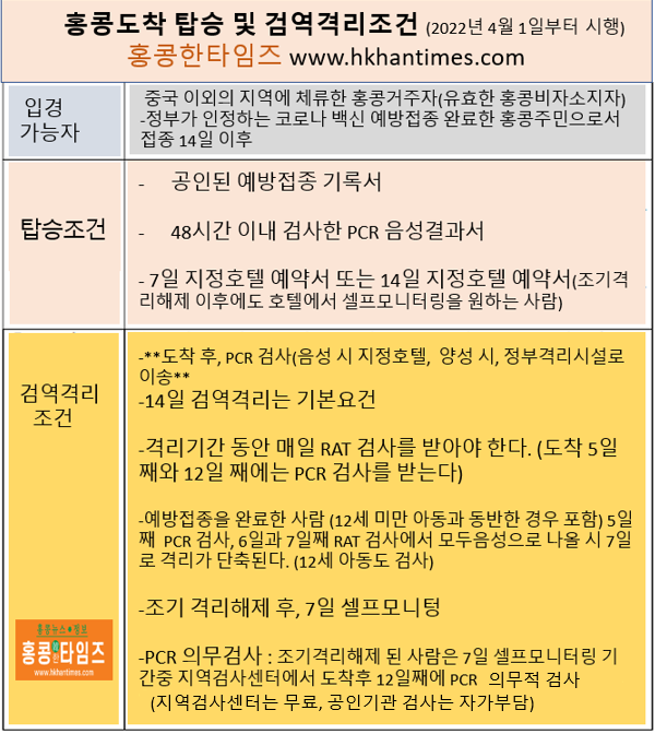 ▲홍콩입경, 탑승&도착, 검역격리조건(2022.4.1부터)