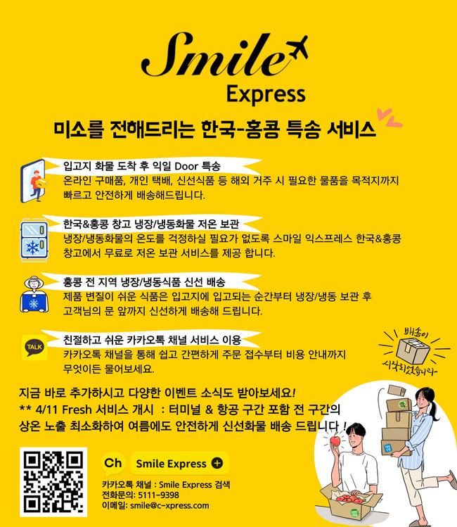 ▲미소를 전해드리는 한국-홍콩 특송 서비스/ 냉장 냉동식품 신선보관 및 배송/ 카카오톡 채널 [Smile Express] 추가하여 쉽고 빠른 상담과 다양한 이벤트를 누리세요.4월11일 Fresh 서비스 (항공 & 터미널 포함 全 구간 저온 Care) 개시!/ 문의: 5111-9398 & smile@c-xpress.com