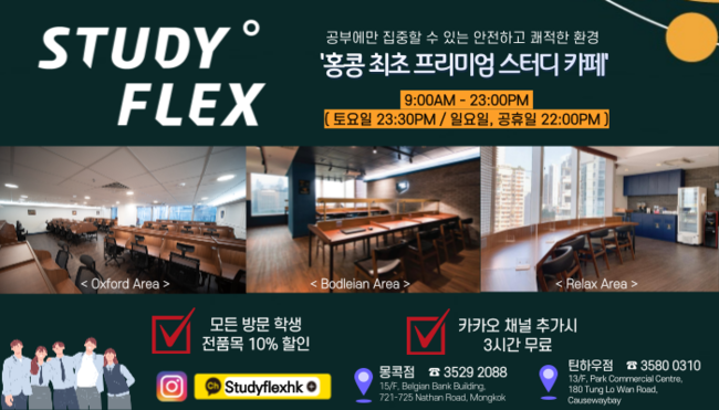 ■ "스터디플렉스" 안전하고 쾌적한 홍콩최초 프리미엄 스터디카페 틴하우 3580 -0310 / 몽콕 3529-2088/ 스터디플렉스 채널추가 시 3시간 무료