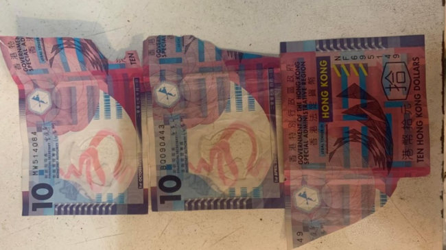 ■지폐 반으로 자른 노인 셩수이 지역에서 한 노인이 물건값을 지불하면서 반쪽짜리 hkd10짜리 지폐를 사용했다. 상인은 지급받은 뒤 나중에 반쪽자리 임을 알아 채고 페이스북에 반쪽짜리 지폐 사진을 공유하고 계획적인 범행에 유의할 것을 당부했다.