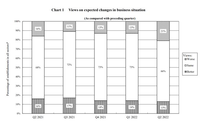사회적거리두기 조치 완화 반영 안돼 22일 통계국이 올해 2분기 기업동향 조사결과를 발표했다. 조사대상 대부분은 1분기와 대체적으로 비슷할 것이라고 예상했으며 21%는 모든 비즈니스 상황이 나빠질 것이라고 응답했다. 식품, 숙박부문은 비즈니스가 향상될 것이라고 예상했다. 정부는 5차확산으로 기업의 심리가 이전 분기보다 더 위축되었으나 고용율은 대체로 안정세로 나타났다고 밝혔다. 조사는 사회적거리두기 조치 완화 이후 상황이 반영되지 않았다고 지적했다.