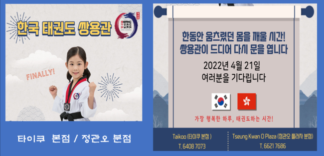 ▲한국태권도 쌍용관 : 타이쿠본점(문의 : 6408-7073)/정관오 분점(문의 :6621 7686
