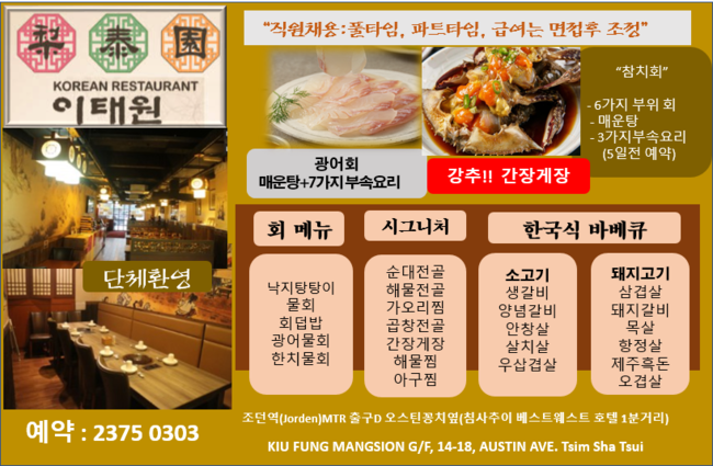 ▲ 이태원 한식당 : 고향의 맛, 침사추이 예약문의 : 2375 0303