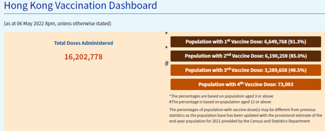 ▲코로나 예방접종률 : 6일 오후 8시현재, 1차 접종률은 91.3%, 2차접종률은 85%로 기록되었다. 3차 접종률은 48.5%이며 4차 접종을 받은 사람은 73,093명으로 나타났다.