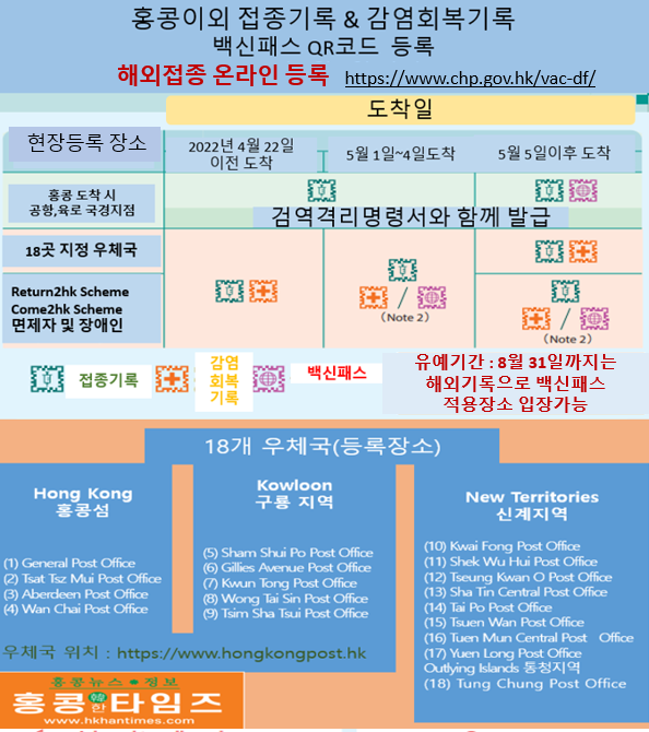 -지난 해 9월 이후, 국경통제소나 지정우체국에서 기록을 신고한 사람이 추가접종을 받았을 경우, 또는 홍콩에서 코로나 감염 회복된 경우에는 www.evt.gov.hk 또는 eHelth 앱에서 QR코드를 다시 다운로드 받을 수 있다. iAM Smart" 앱에서도 QR코드를 다운로드 받을 수 있다.