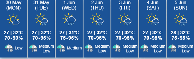 ■ 이번주 날씨 : 고기압의 영향으로 습도가 높고 무더운 날씨가 이어지겠다. 고기압은 이번 주 중반부터 약해질 것으로 예상되며 이번주 주말경에는 지역에 따라 비소식이 있다.