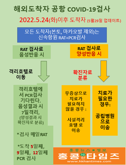 ▣ 만 3세 미만은 PCR 핵산검사 불필요 해외 여러 지역에서 코로나 검사가 축소되어 홍콩 도착하는 영유아는 홍콩발 항공 탑승전 PCR검사 증명서를 제시하지 않아도 된다그러나 홍콩에 도착한 영유아는 대변샘플로 검사를 받게 되며 지정 격리호텔로 이동한다.