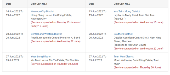 동전교환서비스는 201410월부터 시작되었다지난 531일까지 2대 코인차량이 944,000건의 거래를 통해 76,100만개 코인(hkd116,000)이 수집되었다 2대의 코인카트는 18곳 구역을 순회하면서 특정구역에서 오전 10시부터 오후 7시까지 운영한다동전교환은 현금으로 받거나 AlipayHK, Octopus Wallet, Tap&Go, TNG, WeChat Pay로 충전할 수 있다동전교환 서비스는 무료이다.