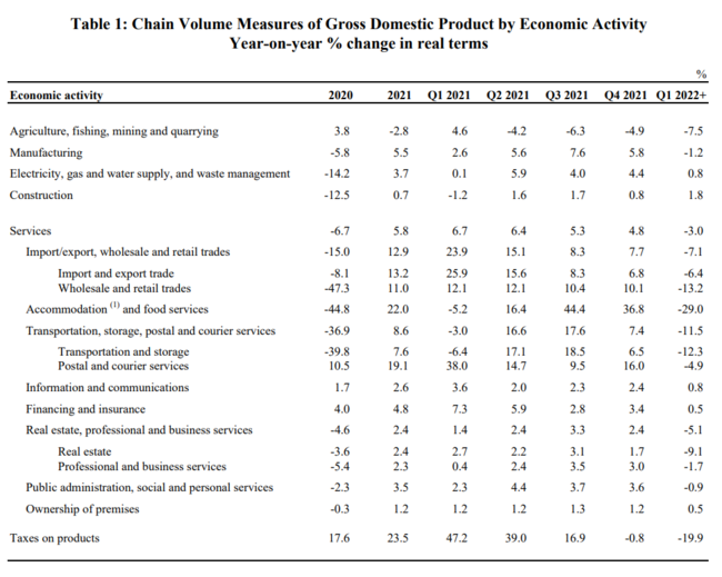 20일, 통계국이 올해 1분기(1월~3월) 산업부문별 GDP 잠정적 수치를 발표했다. 실질 경제 성장률 잠정치가 2021년 4분기보다 감소했다. 잠정수치에 따르면 1분기 전체 GDP는 전년대비 4% 감소했다. 대부분의 산업에서 세계경제 수요감소와 펜데믹으로 인한 국경 간 운송중단으로 지역 경제활동에 타격을 받았다.