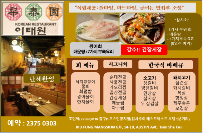 ▲ 이태원 한식당 : 고향의 맛, 침사추이 예약문의 : 2375 0303