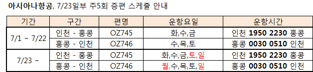 ■ 아시아나가 7월 23일부터 주 5회 운항합니다. 새로운 스케줄입니다.
