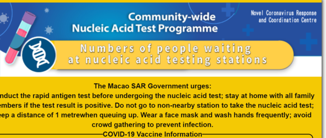 한편, 마카오 전수검사가 오늘 28일에 완료된다. 마카오 정부에 따르면 전수검사에 참여하지 않은 주민의 건강코드는 노란색으로 변환된다. 28일 마카오 당국에 따르면 18만명이 전수검사를 아직 완료하지 않았다. 전수검사는 오늘 저녁 6시에 완료된다