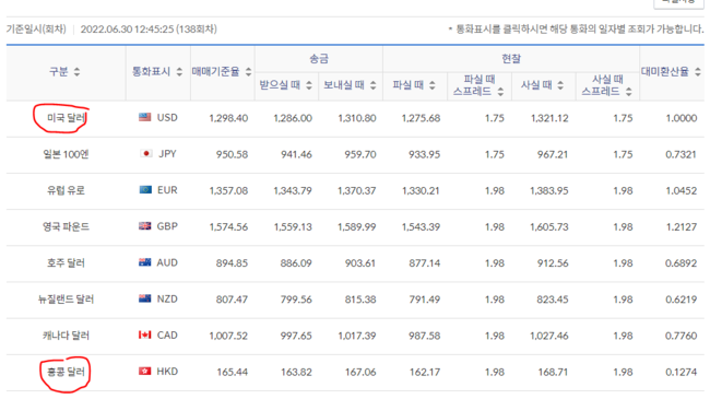 ▲ 환율시세(신한은행) 2022년 6월 30일 12:45 pm 현재(현지시간)