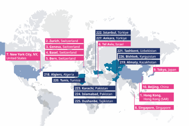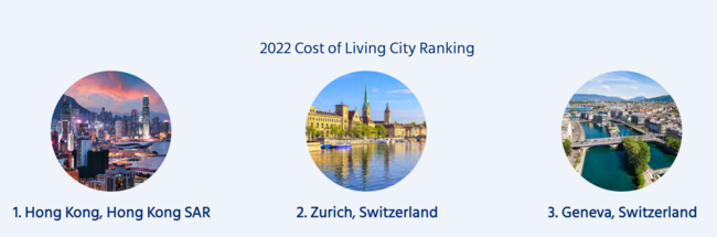 지난해 Ashgabat 조사결과에서는 홍콩이 2위였으나 머셔 2022년 생활지수 조사에서는 1위를 차지했다. 펜데믹 상황으로 기업들이 외국인 직원들에게 지급해야 하는 경비가 증가했고 부동산 숙박시설이 비싼 이유이다.