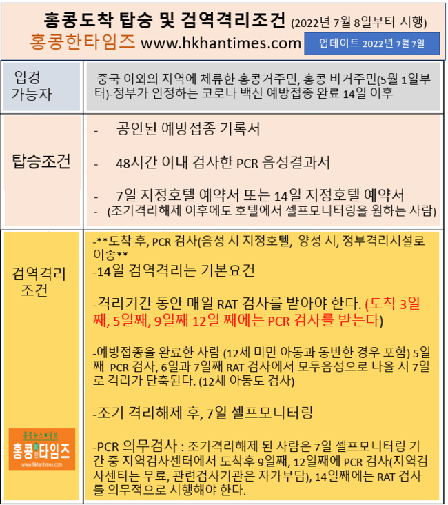 항공운항금지 중단 7일 홍콩정부는 해외도착자에 대한 방역조치를 개정한다고 발표했다. 대부분의 해외유입사례로 인하여 지역전파가 상대적으로 낮고 해외유학생들이 홍콩으로 돌아오는 시기를 고려했다.