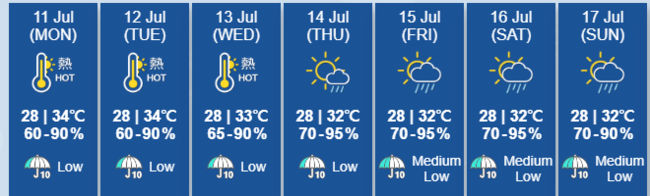 천문대에 따르면 이번 주 며칠 간은 매우 화창하고 매우 덥다가 주말 경에는 저기압의 영향으로 소나기가 내릴 것으로 예상된다. 어제 오후 3시 경에는 최고 34.2도까지올라가 매우 더웠다. 성수 지역은 최고 36.5도까지 올라갔으며 타이렁 지역도 35도까지 올라가 매우 더운 하루였다. 오늘도 최고 34도로 매우 무더울 것으로 예상된다.. 무더운 날씨에 물을 자주 마시고 외부활동 시 주의해야 한다.
