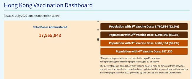 한편, 어제 21일 현재, 코로나 백신 1차 접종률은 92.9%, 2차접종률은 89.3%, 3차 접종률은 66.2%로 기록되었다. 4차는 187,330명이 접종했다.