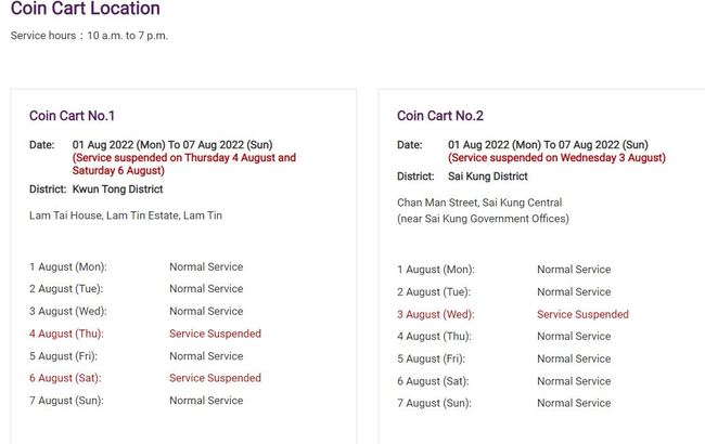 통화국이 오는 8월 29일부터 10월 30일까지 동전수집 차량 스케줄을 공개했다. ▶ 자세한 사항 coincollection.hkma.gov.hk 코인수집 서비스는 지난 2014년 10월에 시작되었으며 올해 7월 말까지 총 969,000건의 거래로 총 hkd7억 7,900만 코인을 수집했다. 동전교환은 현금으로 지급받거나 옥토퍼스등에 충전할 수 있다.
