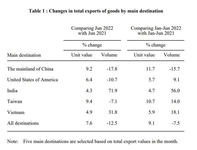 11일, 통계국이 올해 6월 대외무역 상품거래를 발표했다총 상품 수출량은 12.5% 감총 상품수입량도 6.9% 감소했다그러나 수출가격은 7.6% 증가수입가격도 8.4% 증가했다주요 국가로의 수출이 감소해 본토로의 수출 17.8% 감소미국로의 수출 10.7% 감소대만으로의 수출 7.1%가 감소했다반면 베트남으로의 수출 31.8% 증가인도로의 수출 71.9%가 증가했다대만본토미국베트남인도 등으로의 수출가격이 상승했다