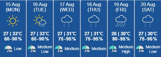 오늘과 내일은 대체로 맑고 최고 온도는 33도로 매우덥겠다. 금요일에는 소나기가 내릴 것으로 예상된다.