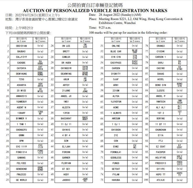 15일, 교통부에 따르면 개인차량 등록마크(번호판) 경매가 오는 28일(일) 완차이 컨벤션센터에서 진행된다. 총 240개 등록마크가 경매에 나온다. 경매에 참여하려면 hkd5,000을 예치해야한다. ▲ 등록마크 경매차량 리스트 : www.td.gov.hk