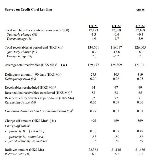 ■ 올해 2분기 신용카드 대출 현황 15일, 통화당국이 올해 2분기 신용카드 대출현황 조사를 발표했다. 올해 6월말 카드대출 미수금 총계는 전분기 대비 8.6% 증가한 hkd1,260억으로 나타났다. 연체율은 전분대비 0.31% 감소했다.