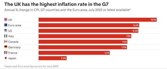 19일, G7 국가의 7월 소비자물가가 발표되었다. G7 국가중 영국이 40년 만에 최고치인 10.1%에 도달했다. 영국로칼 미디어에 따르면 국민들은 1970년대보다 더 어려운 상황이라고 토로하고 6명중 1명은 식비를 줄이기 위해 끼니를 거르고 있다. 영국의 에너지는 대부분 수입하는데 우크라이나 전쟁으로 인하여 가스, 석유가격이 크게 상승했기 때문이다.