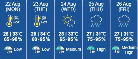 저기압의 영향으로 오늘 오전 몇 차례 소나기가 내리다 오후에는 점차 맑아 질 것으로 예상된다최고기온 33도까지 올라가 매우 덥겠다. *태풍진입 태풍이 필리핀에서 시속 10km로 이동하고 있다오는 수요일(24일)경에는 홍콩 800km까지 진입할 것으로 예상된다천문대는 저기압 이동이 아직 불확실하다.”고 예보했다.