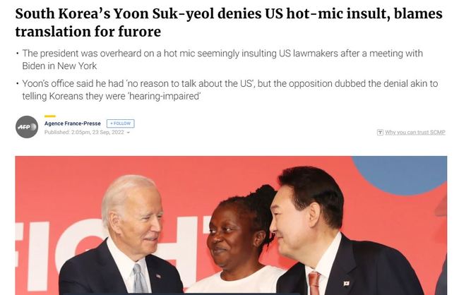 SCMP가 한국 윤석열 대통령 관련 기사를 게시했다. 뉴욕에서 바이든 대통령과 만난 후 회견장에서 미국 의원들을 모욕하는 발언이 현장에 있던 기자의 마이크에 담겼다. 어제 22일, 외신들은 한국 대통령의 욕설을 주목하는 기사들을 게시했다.