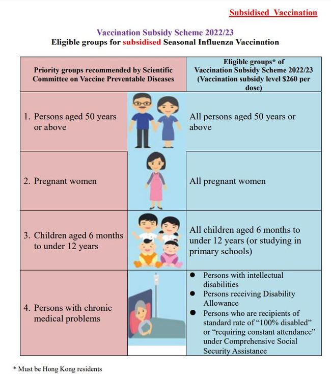 ▲ 무료접종 대상 홍콩거주민 임산부요양원, 50세 이상, 65세 이상만성질환자의료진, 6개월~12세 미만 어린이가금류 시설 작업자돼지농장 작업자