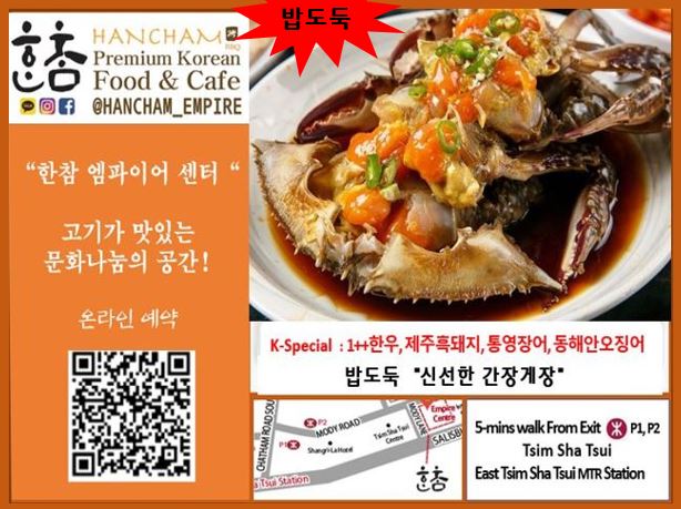 ▲ 한참 엠파이어 : 고기와 게장이 맛있는 문화나눔의 한식당, 동침사츄이 리갈구룡호텔 맞은편, 예약번호 2511 6316 (침사추이 P1, P2 출구)