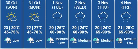 태풍이 필리핀에서 남중국해로 이동하고 있다. 오늘 밤에 태풍이 홍콩과 약 800km이내 진입할 것으로 보여 태풍 1호가 발령될 수 있다. 태풍은 이번주 초에 홍콩과 가까워져 강한바람이 불 것으로 예상된다. 오늘 최저기온은 23도로 낮과 밤의 기온차가 심해 환절기 건강에 유의해야한다