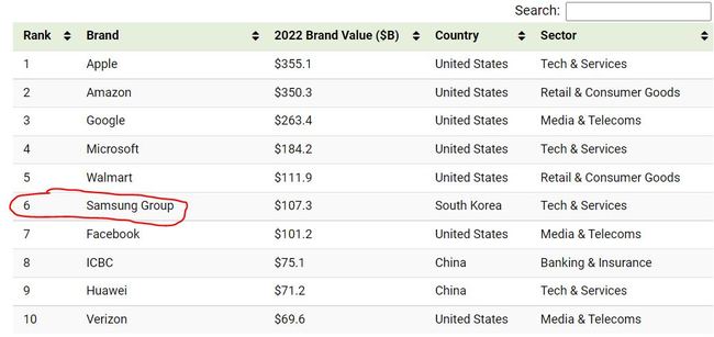 최근 발표된 Brand Finace의 "Global 500 보고서에 따르면 애플의 브랜드 가치가 usd3,551억으로 1위를 차지했다. 세계최대 기술회사인 애플은 스마트폰 아이폰이 미국에서 50%이상 스마트폰 시장을 장악하고 있다. 2위는 아마존, 3위 구글, 4위 마이크로 소프트, 5위 월마트가 상위에 올랐다. 삼성은 usd1073억 브랜드가치로 6위를 차지했다.
