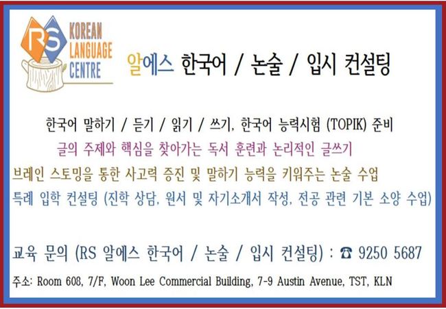 ■ 알에스 한국어 / 논술 / 입시 컨설팅 : 한국어와 논술, 그리고 한국 대학 입시를 고민할 때 가장 먼저 생각나는 곳, 교육 문의 : ☎ 9250 5687