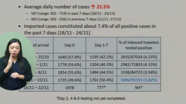 지난 7일 간의 해외유입 일일사례가 21.5% 증가했다. (11월 18일~24일까지) 는 총 감염사례 약 7.4%를 차지했다.