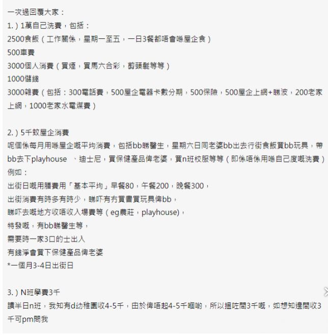 네티즌들은 아내의 수입에서 생활비로 사용하지 않는다는 의견이다. 또 다른 네티즌은 자신의 급여 hkd80,000로 매달 모든 비용을 지불하고도 hkd40,000 저축을 한다는 의견도 게시 되었다.