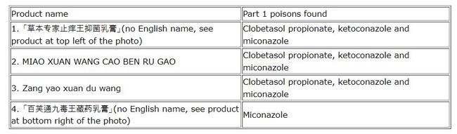 6일, 보건당국은 피부연고제 4개를 사용하지 말 것을 촉구했다. 해당제품은 홍콩약품에 등록되어 있지않았고 규제약품 성분이 포함되어 있었다. 미등록 약품 판매는 형사범죄로 최고 hkd10만, 징역 2년이 주어진다. 홍콩 모든 의약품은 HK-XXXXX로 표시되어 있다.