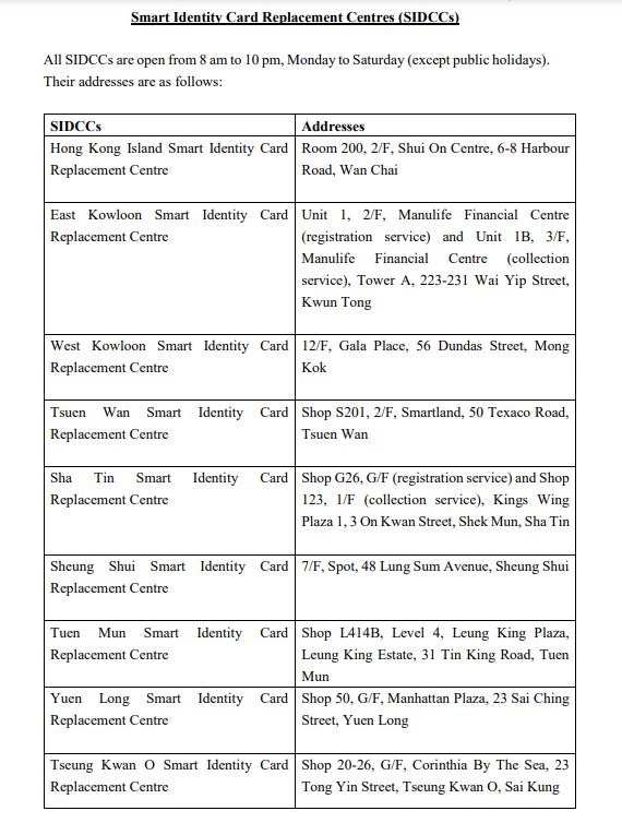 특별한 이유로 홍콩에 거주하지 않은 홍콩주민은 홍콩으로 돌아온 후 30일 이내에 새로운 스마트 아이디 카드 교체를 신청할 수 있다.