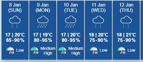 앞으로 며칠동안은 동쪽에서 불어오는 바람으로 흐리고 비가 올 것으로 예상된다. 최저 17도에서 20도사이로 온화하고 습하다. 다음주 일요일에는 15도로 떨어지기 시작해 월요일(16일)에는 13도까지 내려갈 것으로 예상된다.