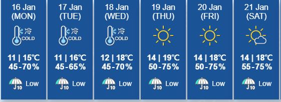 ■ 한랭경보령, 오늘 가장 춥다 오늘 최저 기온이 11도 이번 겨울 중 가장 낮은 기온을 기록했다. 북쪽에서 불어오는 계절풍으로 이번 주는 건조하고 추운 날씨가 될 것으로 예상된다.