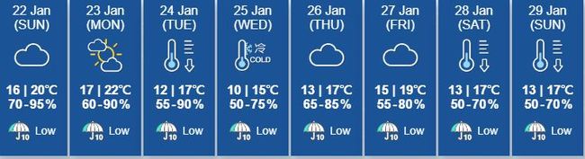 오늘 아침은 최저 16도로 지역에 따라 비가내리는 곳도 있겠다. 오는 목요일과 수요일에는 10도까지 떨어져 추운 날씨가 될 것으로 예상된다.